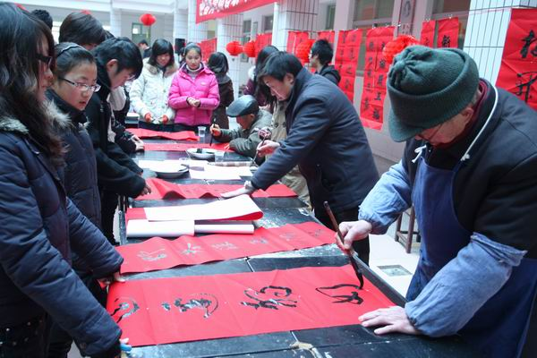 老同志代表王仲飞、陈道义两位老教师,教师代表宋金耀、卞瑞老师和来自学院各系的10余名学生书法爱好者现场挥毫,书写对联作品200余副。