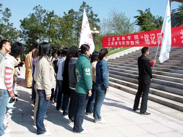 2007年4月3日,在清明节到来之际,学院组宣处、团委与江苏省句东劳教所在茅山老区“苏南抗日胜利纪念碑”前隆重举行了以“铭记历史、共享阳光”为主题的教育活动,这是双方继2006年共同开展“让青春在这里闪光”暨社会主义荣辱观教育基地共建以来的第二次合作。