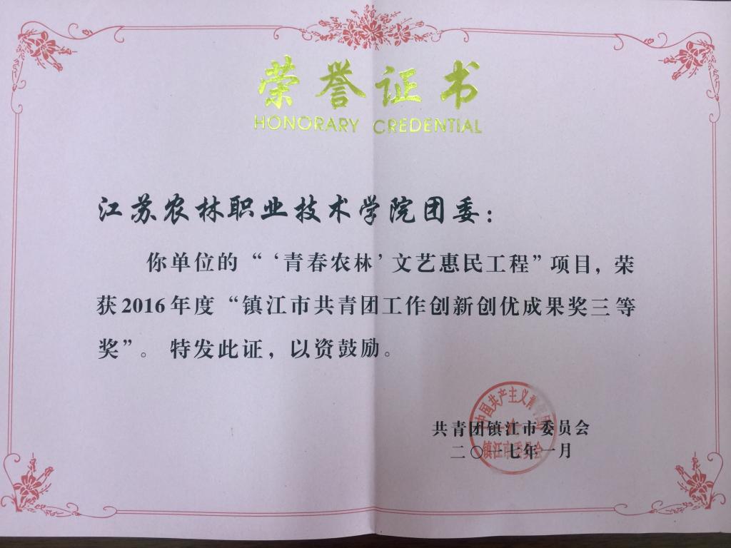 我院团委副书记杨春梅荣获2016年度“镇江市共青团工作先进工作者”荣誉称号,由我院团委申报的“‘青春农林’文艺惠民工程”项目,荣获2016年度“镇江市共青团工作创新创优成果三等奖”。