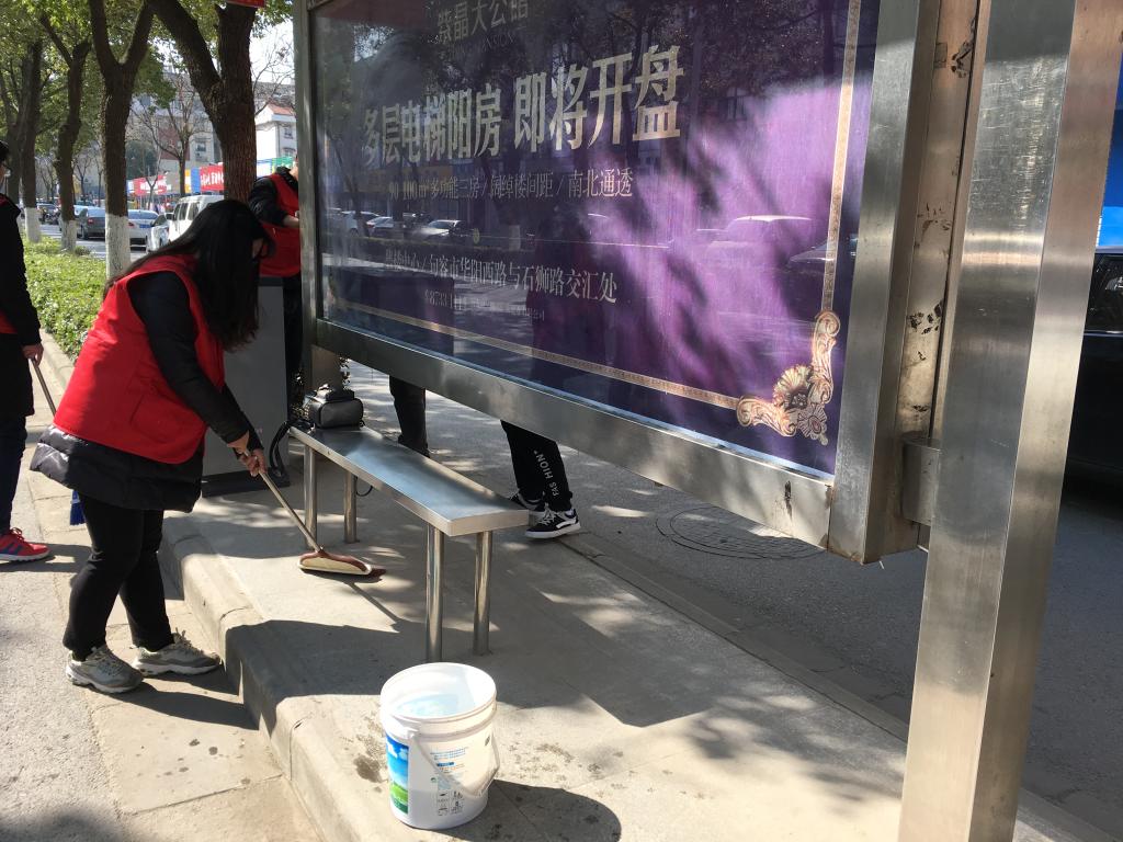 活动中,“青禾”志愿者们分为三组,携带水桶、抹布、笤帚、铲子等工具,从学校南校区北门出发,沿曙光至句容教育局、聚合园至民生银行、学府雅苑至崇明小学,整理和打扫沿路14个公交站台和公共自行车点。过程中,志愿者们撸起袖子,团结协作,将公交站台和公共自行车打扫干净,用铲子清理干净小广告。