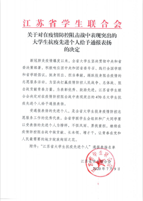 近日,由江苏省学生联合会发布的《关于开展江苏省大学生抗疫先进个人评选表扬活动的通知》评选结果公布,我院束方会、郁晓辰、吴鑫涛、彭滟洁四名同学荣获“江苏省大学生抗疫先进个人”称号。