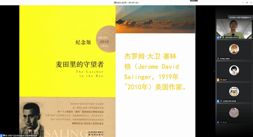 为引导鼓励广大青年学生充分利用疫情居家时间读经典、学新知,培养良好的阅读和思考习惯,营造崇尚学习的浓厚氛围,5月27日晚,由学院团委主办、信息工程学院团委承办的“农林青年说”——“唯有书本最愈人”线上分享会在腾讯会议平台开展。学院团委、各二级学院(校区) 团委全体团干部,近300名团员青年参与了此次活动。