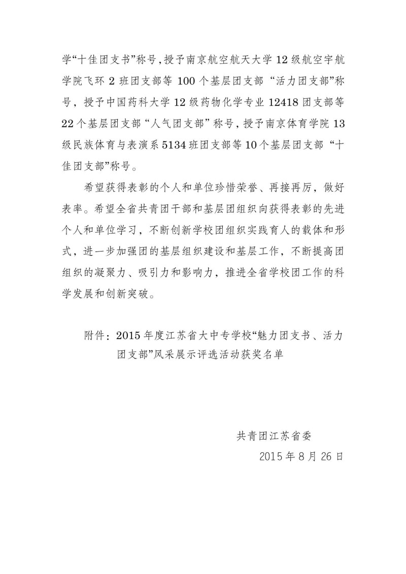 8月26日,共青团江苏省委公布了《关于表彰2015年度江苏省大中专学校“魅力团支书”、“活力团支部”的决定》。我院机电工程系2013级数控技术团支部在此次评选活动中获得“活力团支部”称号。