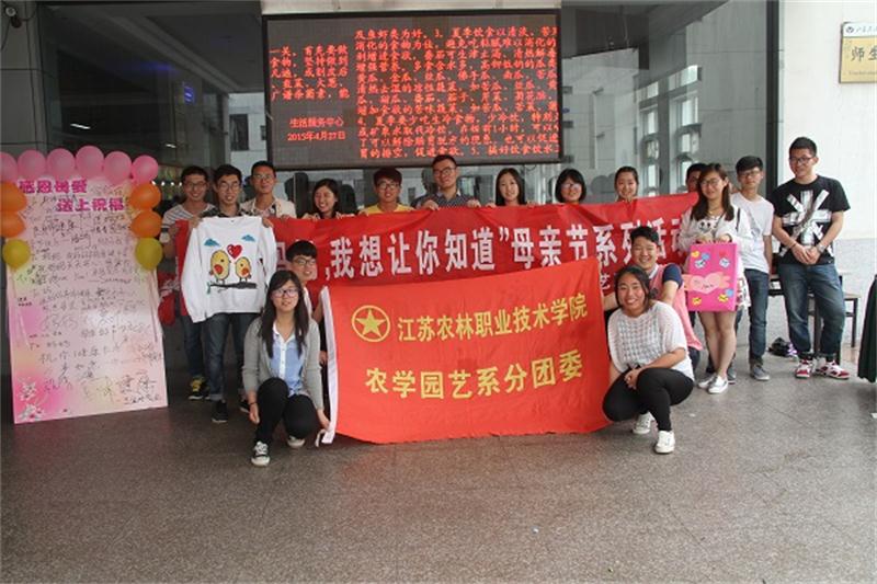 谁言寸草心,报得三春晖。2015年5月8日,在母亲节即将来临之际,农学园艺系分团委学生会在食堂门口开展了“妈妈,我想让你知道”感恩母亲节系列活动,通过现场给妈妈写信、画T恤衫、为妈妈许愿和横幅钉纽扣等方式鼓励同学们寄语母亲、感恩母亲。江苏公共频道报道了此次活动。