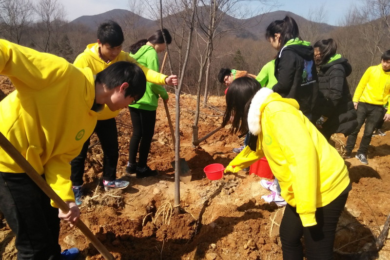 身穿黄色外套的小伙伴们,戴上标志着志愿者的小红帽,手持工具,在林场工作人员的指导下,将一棵棵代表生命和希望的小树苗种下。在植树的过程中,同学们发挥了各自的潜力并贡献了自己的力量。男生挖树坑,女生除草和找水源,并用带来的工具提了水浇到挖好的树坑中。