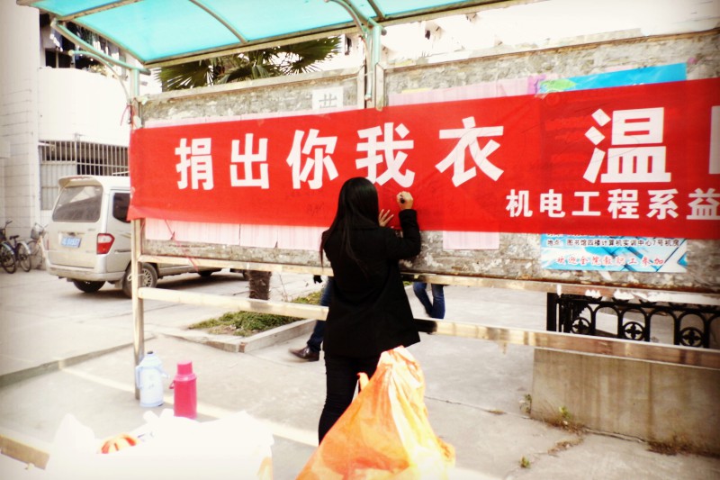 “当寒冬来临,凉风袭来,我们都在为自己添加棉衣之时,你们有没有想到在山的那边还有好多没有衣物的孩子,在那饱受寒冬的侵蚀;你们在为自己的衣服挑三拣四之时,你们有没有想到贫困地区的孩子穿的是粗布麻衣”。为了让这些孩子能过一个温暖的冬天,志愿者们在全校广做宣传,筹集大量的御冬棉衣,线衣线裤,鞋子,围巾,有的同学没衣物捐,竟把自己的包包都捐出来,为的只是体现对贫困地区孩子的一份爱心。