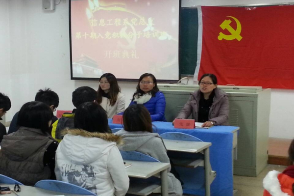 为切实加强对入党积极分子入党前的培训教育,11月25日晚七点,在教学楼J1-B108,信息工程系党总支举办了第十期入党积极分子培训班开班典礼,共49名优秀的学员参加了本期培训。