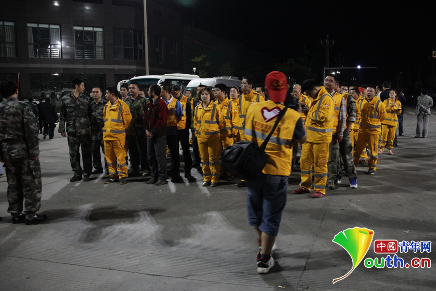 四川雅安地震震后第一夜,大批志愿者集结在震中芦山县,等待分配参与抗震救灾志愿服务工作。中国青年网记者 张炎良 摄